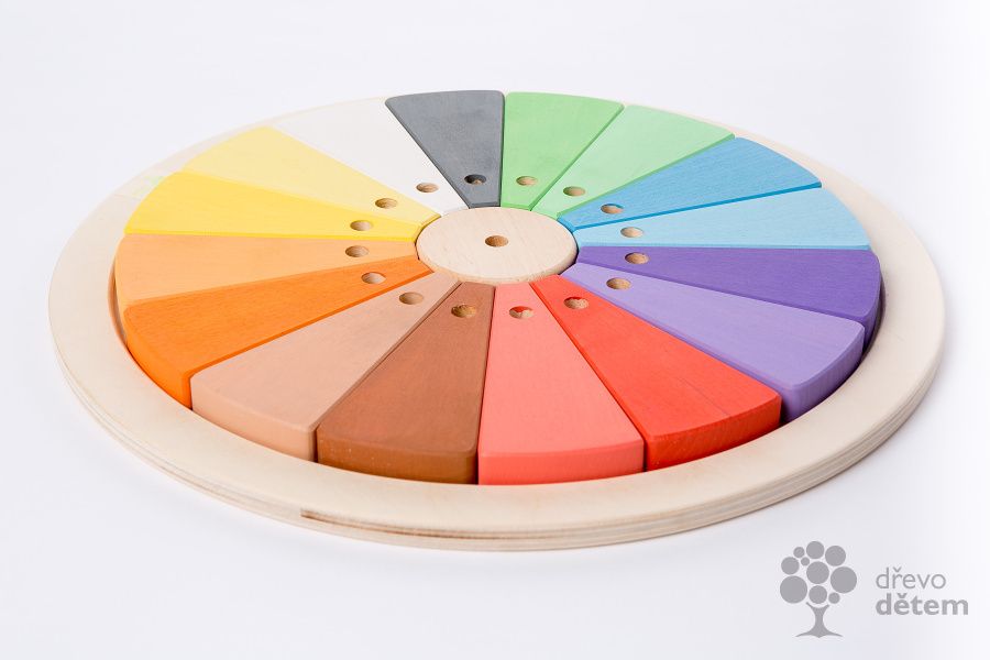 Další barevnost do naší pestré rodiny. Tahle stavebnice má kruhovitý tvar a skládá se z 16 dřevěných kruhových výsečí, doplněných o kolečko uprostřed, tak jako děti kreslí sluníčko. Každá výseč má jinou barvu, respektive je zde osm barev ve dvou odstínech. V každé je průchozí otvor na užší straně a neprůchozí na straně širší, lze je nasazovat na tyčku a vyrobit třeba spirálové "schodiště", nasadit přiložené krátké tyčky jako zábradlí a poslat dolů dřevěnou kuličku, která je taktéž součástí. Další možnosti skládání s tyčkou i bez jsou jen na dětské fantazii .........třeba viz foto.